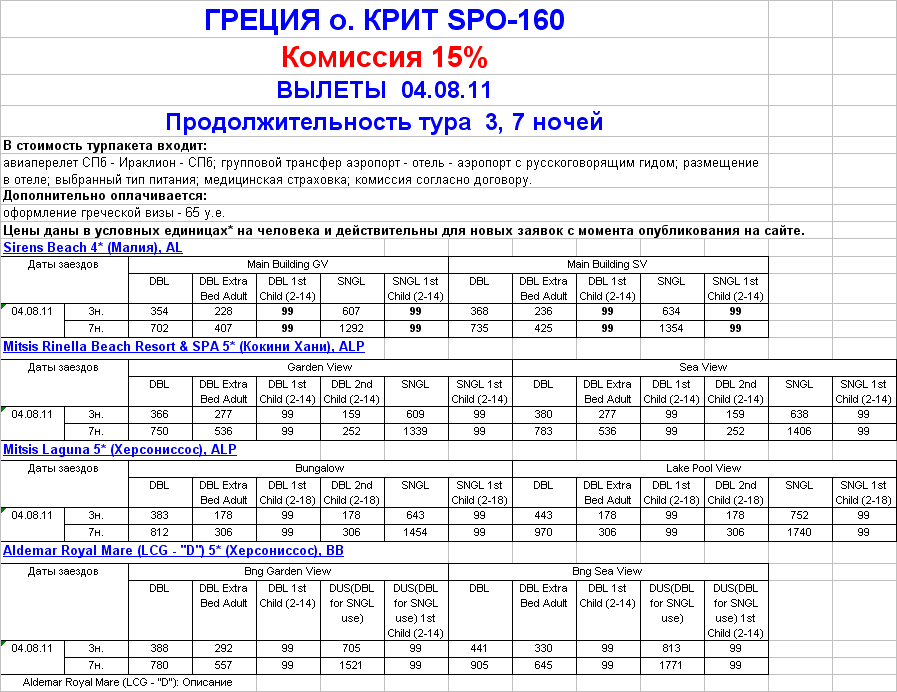ГРЕЦИЯ, о.КРИТ - ВЫЛЕТ 04.08 -КОМИССИЯ 15% - MITSIS RINELLA, LAGUNA, SIRENS BEACH 4* от 354 у.е от фирмы ЮЖНЫЙ КРЕСТ |