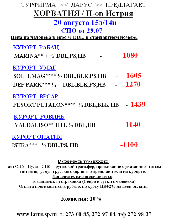 29 Июл 2011 14:58:12 ХОРВАТИЯ / П-ов Истрия 20 августа 15д/14н СПО от фирмы ЛАРУС
