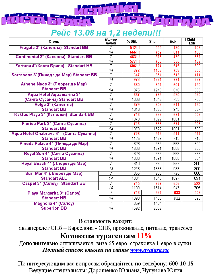 31 Июл 2011 11:00:58 ИСПАНИЯ 13.08 Коста Брава и Коста Дорада, Ком. 11%, Лучшие отели, Падение цен от фирмы АВАТАРА