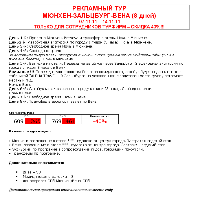01 Авг 2011 14:54:37 РЕКЛАМНЫЙ ТУР МЮНХЕН-ЗАЛЬЦБУРГ-ВЕНА (8 дней) 07.11.11 - 14.11.11 от фирмы ФЛАМИНГО