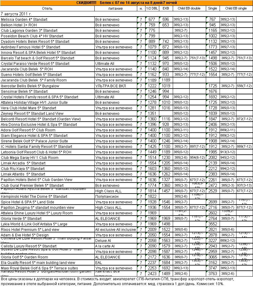 02 Авг 2011 10:42:20 ТУРЦИЯ. Белек с 07 по 14 августа на 8 дней/7 ночей - от фирмы АЛМА ТУР