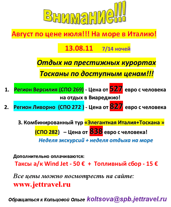 06 Авг 2011 10:04:50 ИТАЛИЯ - 13.08 Отдых на Море, Август по Цене ИЮЛЯ от фирмы ДЖЕТ ТРЕВЕЛ САНКТ-ПЕТЕРБУРГ