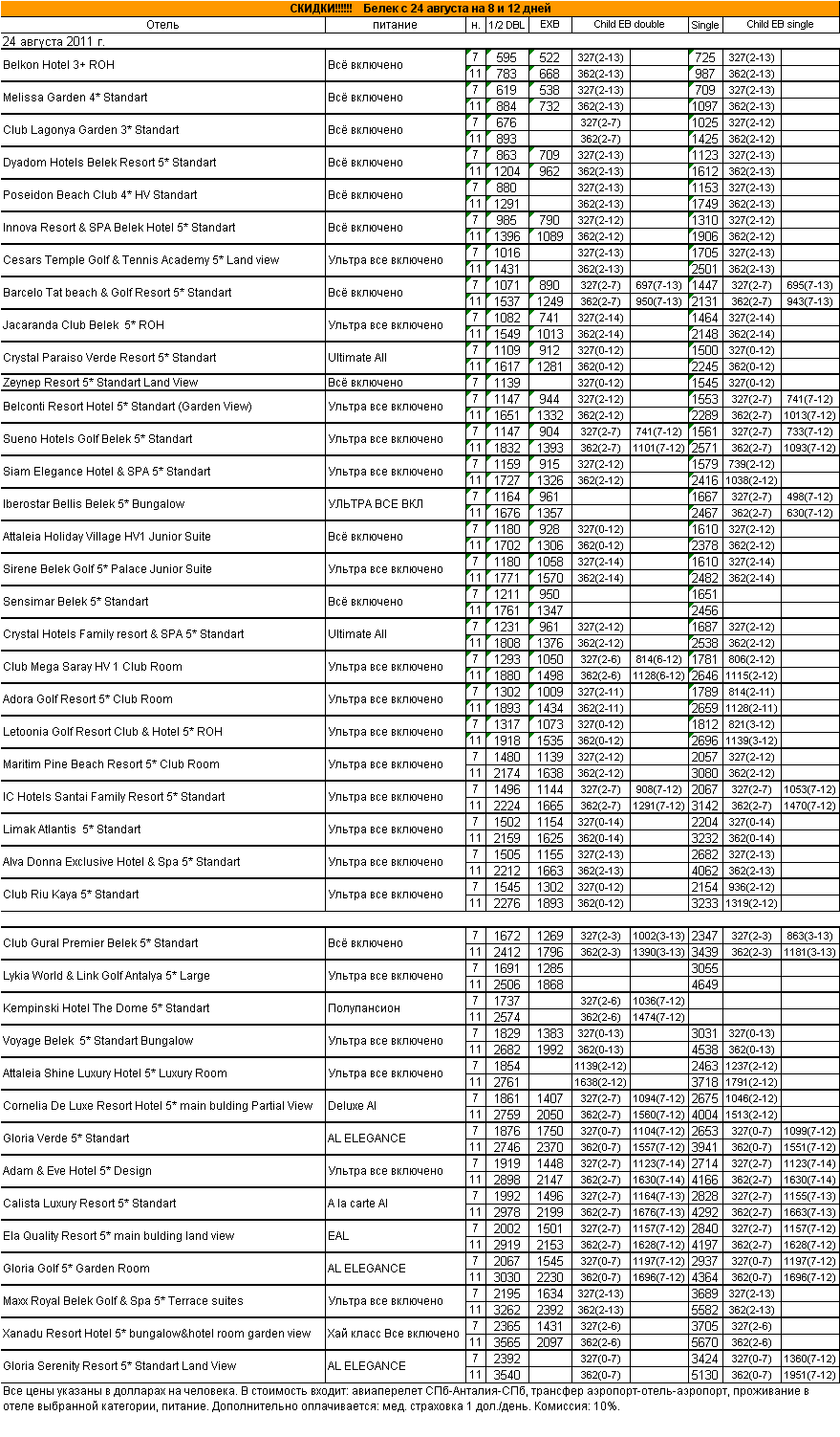 09 Авг 2011 15:02:18 ТУРЦИЯ. Белек с 24 августа на 8 и 12 дней от фирмы АЛМА ТУР