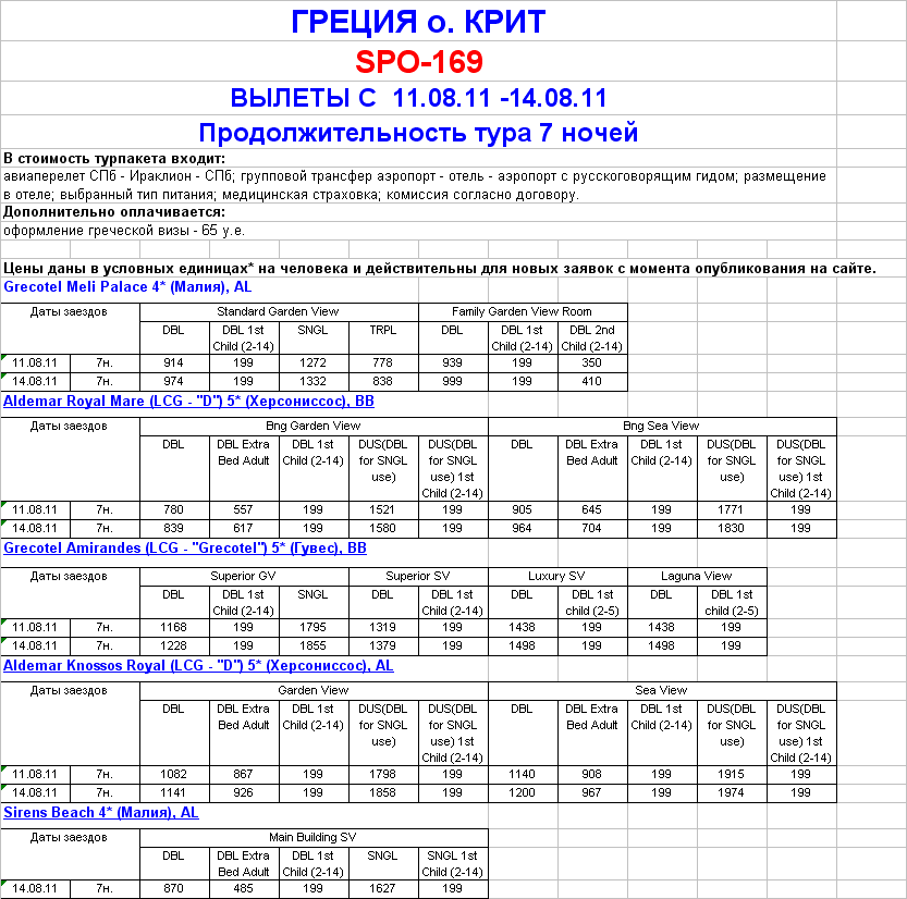 ГРЕЦИЯ, о.КРИТ - ВЫЛЕТ 11.08 и 14.08 -ALDEMAR, GRECOTEL и SIRENS BEACH, ДЕТИ 199 у.е. от фирмы ЮЖНЫЙ КРЕСТ |