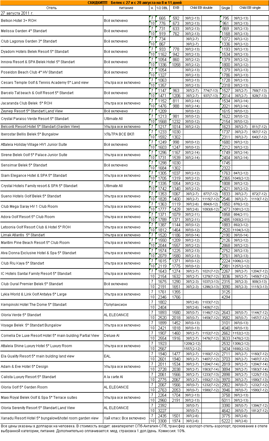 10 Авг 2011 17:00:59 ТУРЦИЯ. Белек с 27 и с 28 августа на 8 и 11 дней от фирмы АЛМА ТУР