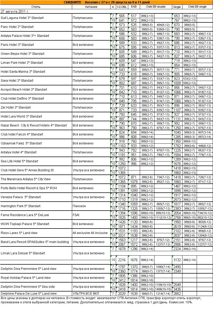 10 Авг 2011 17:01:22 ТУРЦИЯ. Анталия с 27 и с 28 августа на 8 и 11 дней от фирмы АЛМА ТУР