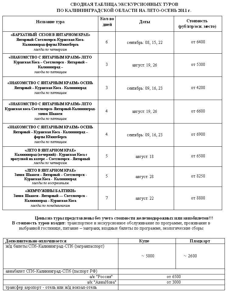 Калининградскую область на ЛЕТО-ОСЕНЬ 2011 г. Комиссия агенствам - 12%