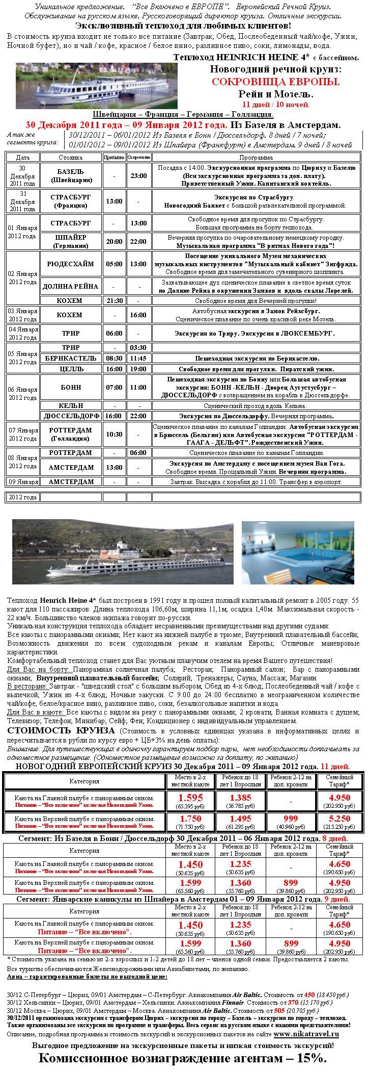 15 Авг 2011 17:22:24 ЕВРОПА - СОКРОВИЩА ЕВРОПЫ - Новогодний Речной Круиз. Русский борт т/х Heinrich Heine от фирмы НИКА