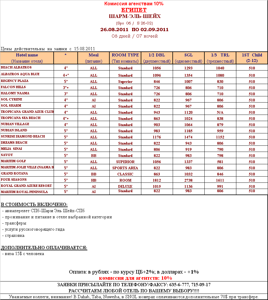 15 Авг 2011 17:39:00 ЕГИПЕТ - ШАРМ ЭЛЬ ШЕЙХ 26.08.2011 ПО 02.09.2011 от фирмы EL DAKAMY TRAVEL