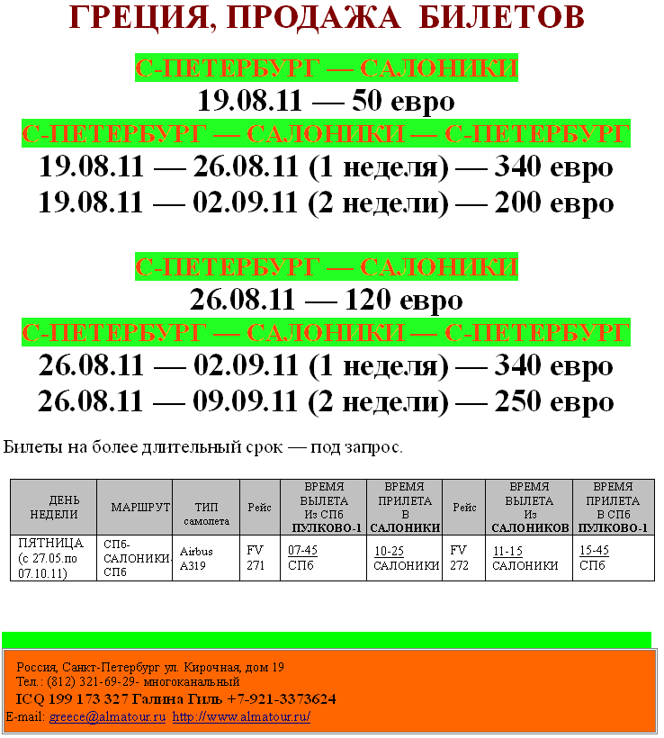17 Авг 2011 11:44:07 ГРЕЦИЯ, распродажа авиабилетов Салоники-СПб 19.08, 26.08 от фирмы АЛМА ТУР
