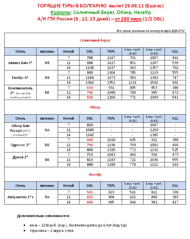 23 Авг 2011 11:03:17 БОЛГАРИЯ Бургас 26.08 от 280 ЕВРО от фирмы КАПРИКОН