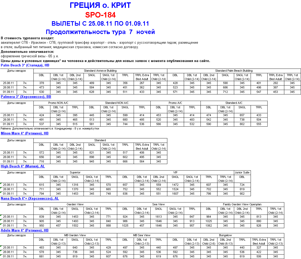 ГРЕЦИЯ, о.КРИТ - ВЫЛЕТЫ 25.08 - 01.09 - СКИДКИ НА ОТЕЛИ 3-5* от 378 у.е от фирмы ЮЖНЫЙ КРЕСТ |