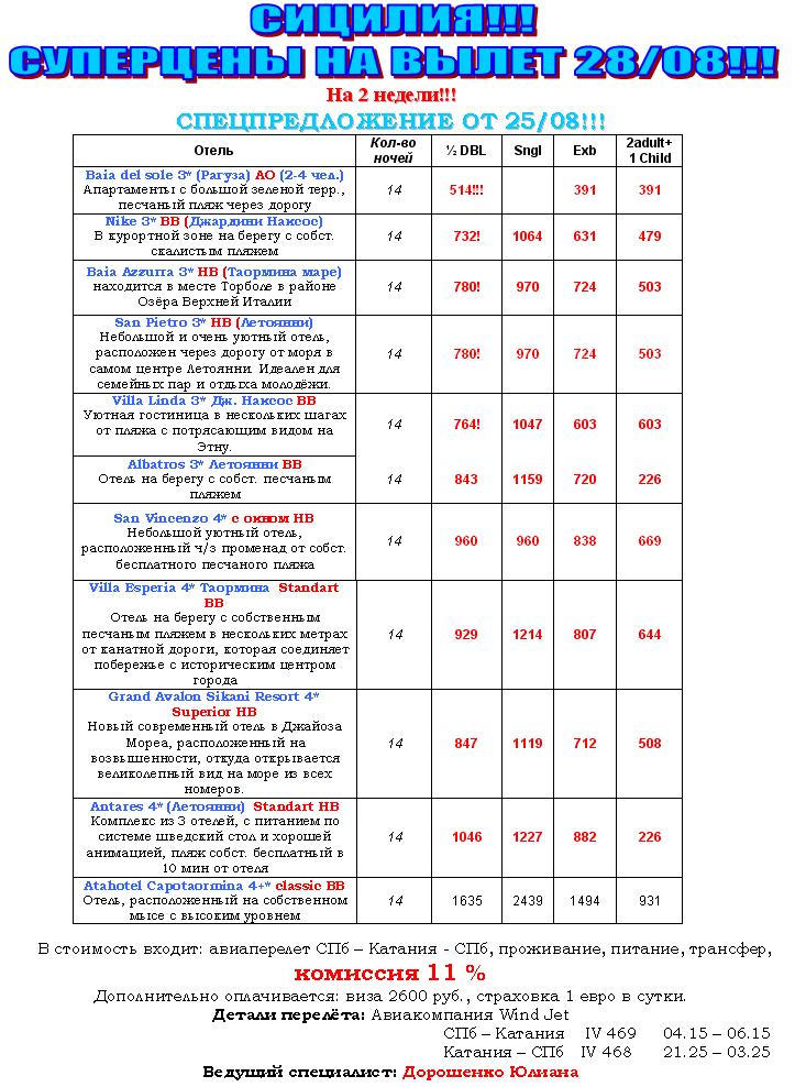 25 Авг 2011 19:01:35 ИТАЛИЯ - Сицилия 28.08 ОТЕЛИ 3*-4* Ком.11% от фирмы АВАТАРА