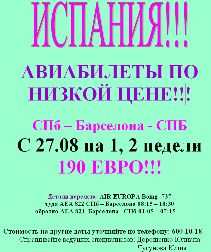 25 Авг 2011 16:01:25 ИСПАНИЯ - Авиабилеты в Барселону на 27.08 по низкой цене от фирмы АВАТАРА