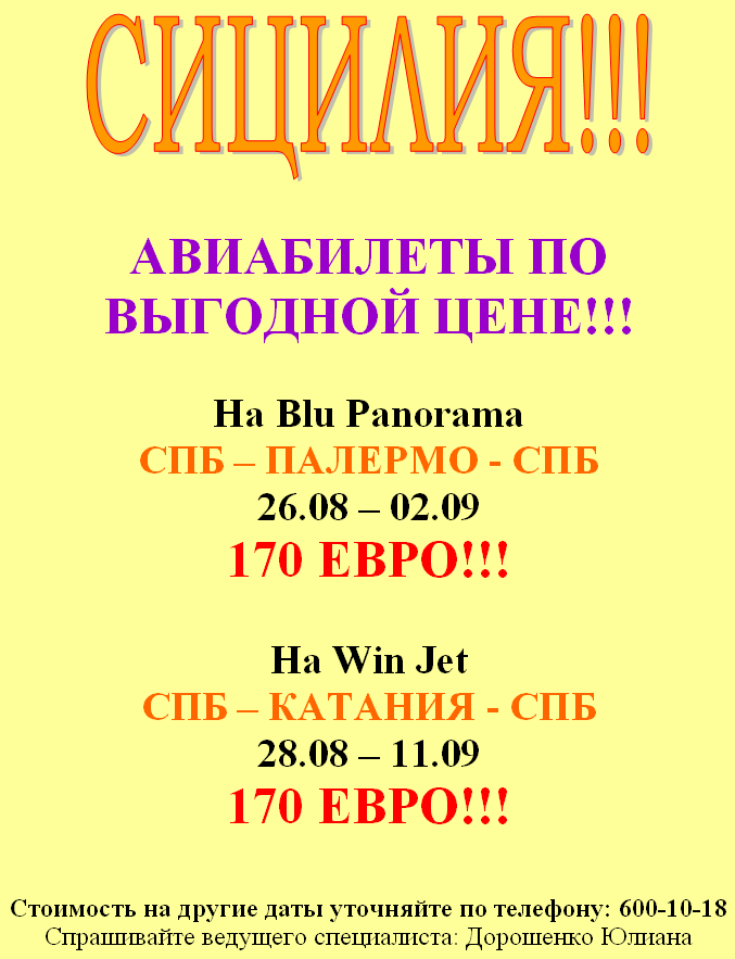 26 Авг 2011 10:35:02 ИТАЛИЯ - Сицилия - Авиабилеты по привлекательной цене на вылеты 26.08 и 28.08 от фирмы АВАТАРА