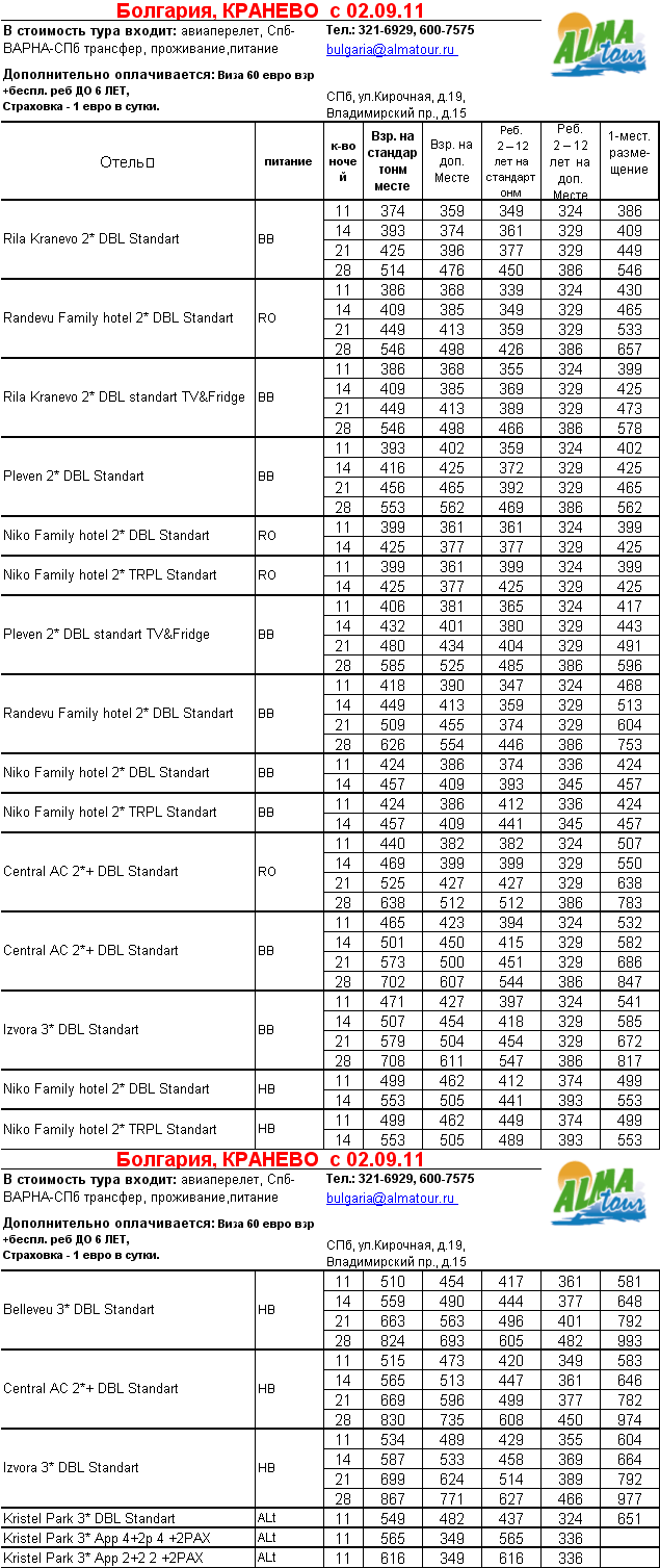 29 Авг 2011 12:55:04 БОЛГАРИЯ, КРАНЕВО с 02.09 от фирмы АЛМА ТУР