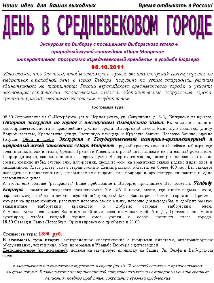 01 Сен 2011 09:16:39 РОССИЯ - Выборг 08.10 тур "День в Средневековом Городе" от фирмы СЕВЕРНАЯ ВЕНЕЦИЯ
