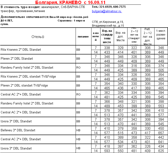01 Сен 2011 15:53:21 БОЛГАРИЯ, КРАНЕВО с 16.09.11 от фирмы АЛМА ТУР