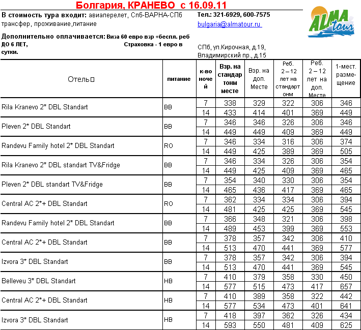 02 Сен 2011 11:16:55 БОЛГАРИЯ, КРАНЕВО с 16.09.11 от фирмы АЛМА ТУР