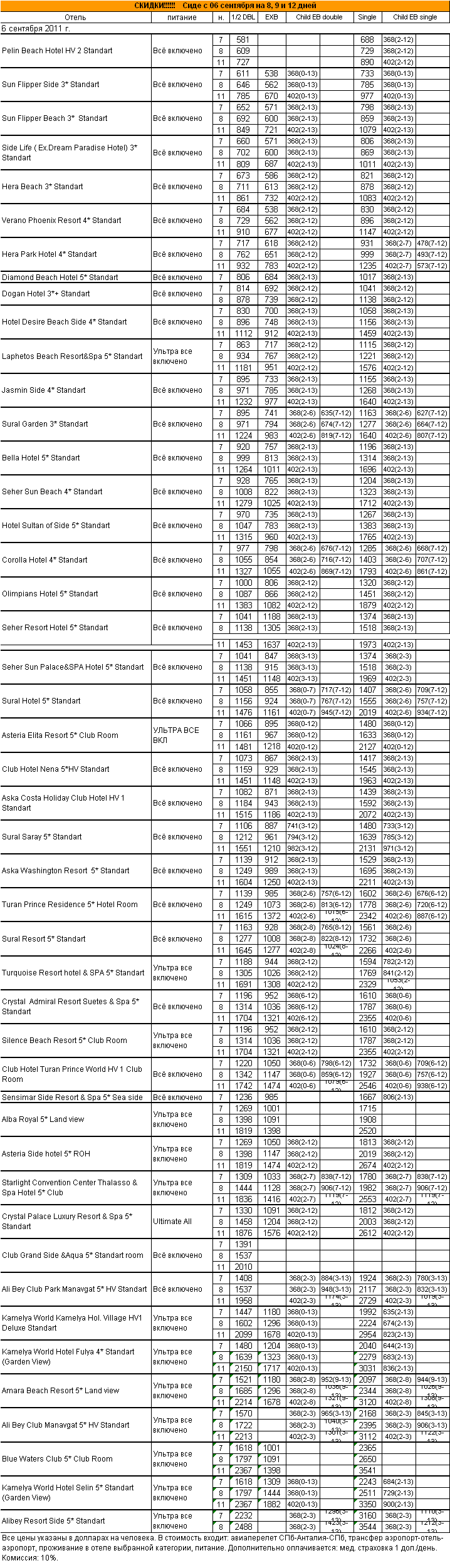 02 Сен 2011 14:41:01 ТУРЦИЯ - СИДЕ с 06 сентября на 8, 9 и 12 дней от фирмы АЛМА ТУР