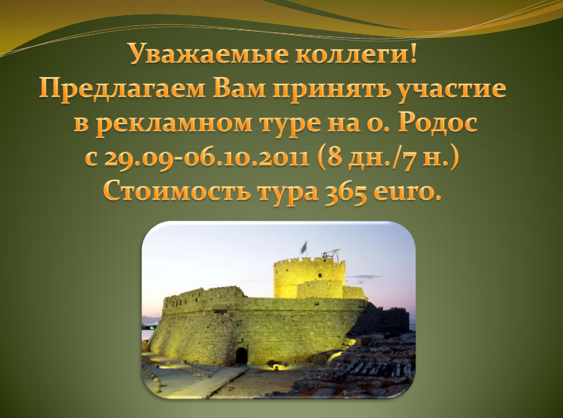 06 Сен 2011 17:28:31 ГРЕЦИЯ. РОДОС. РЕКЛАМНЫЙ ТУР НА О. РОДОС 29.09-06.10.2011 (8 ДН. / 7 Н.). СТОИМОСТЬ ТУРА 365 EURO! КОЛИЧЕСТВО МЕСТ ОГРАНИЧЕНО! от фирмы СОЛВЕКС