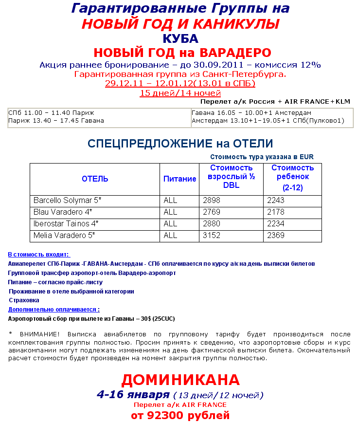 10 Сен 2011 10:02:45 КУБА гарантированная группа на НОВЫЙ ГОД 29 декабря -12 января 2012 г. от 81 тыс.руб. от фирмы ПИТЕРТУР