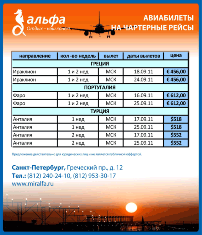 14 Сен 2011 09:05:22 АВИАБИЛЕТЫ на Чартерные рейсы из Москвы - ГРЕЦИЯ - КРИТ, ПОРТУГАЛИЯ, ТУРЦИЯ от фирмы АЛЬФА СТ