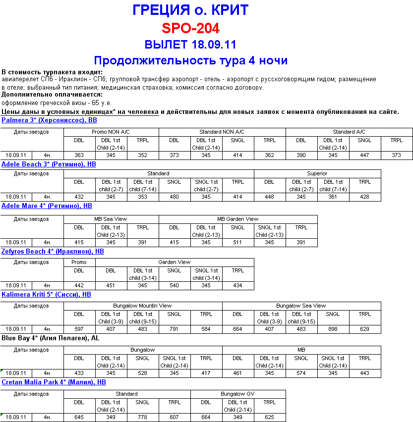 ГРЕЦИЯ, о.КРИТ - ВЫЛЕТ 18.09 - ПРОДЛИ ВЫХОДНЫЕ - ОТЕЛИ 3-5* от 363 у.е. от фирмы ЮЖНЫЙ КРЕСТ |