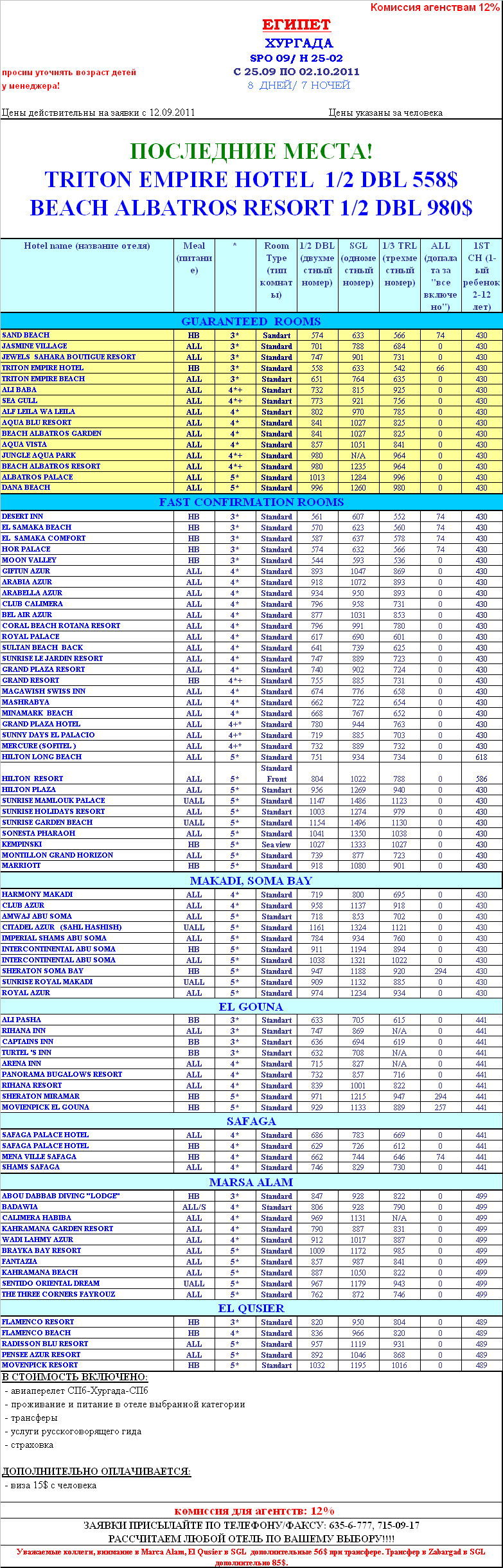 15 Сен 2011 11:51:33 ЕГИПЕТ - ХУРГАДА С 25.09 ПО 02.10.2011 от фирмы EL DAKAMY TRAVEL