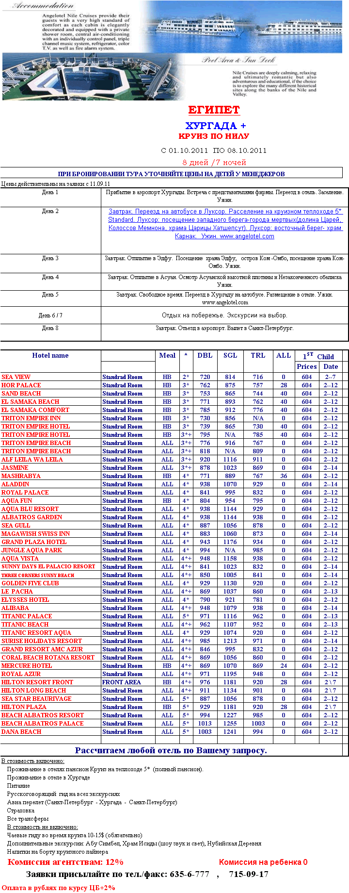 19 Сен 2011 19:29:31 ЕГИПЕТ - ХУРГАДА + Круиз по Нилу 01.10-08.10 от фирмы EL DAKAMY TRAVEL