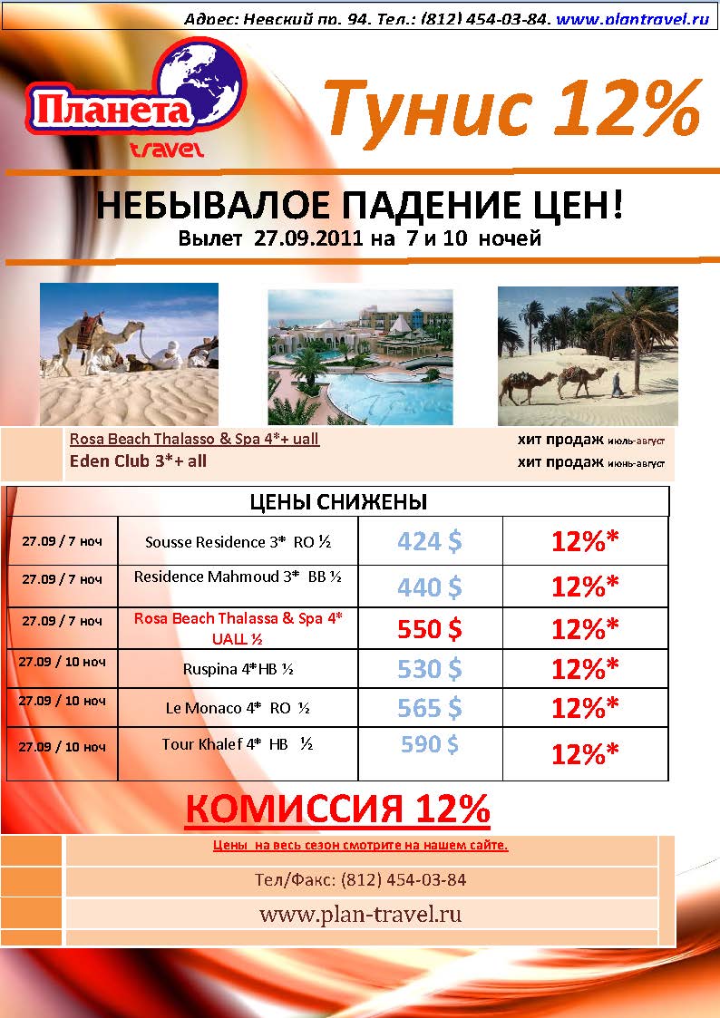 22 Сен 2011 13:55:55 ТУНИС на 27 сентября. Небывалое падние цен! от 400$! от фирмы ПЛАНЕТА TRAVEL