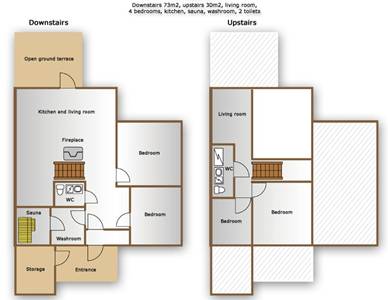 В коттедже на первом этаже: 2 спальни, гостиная (в