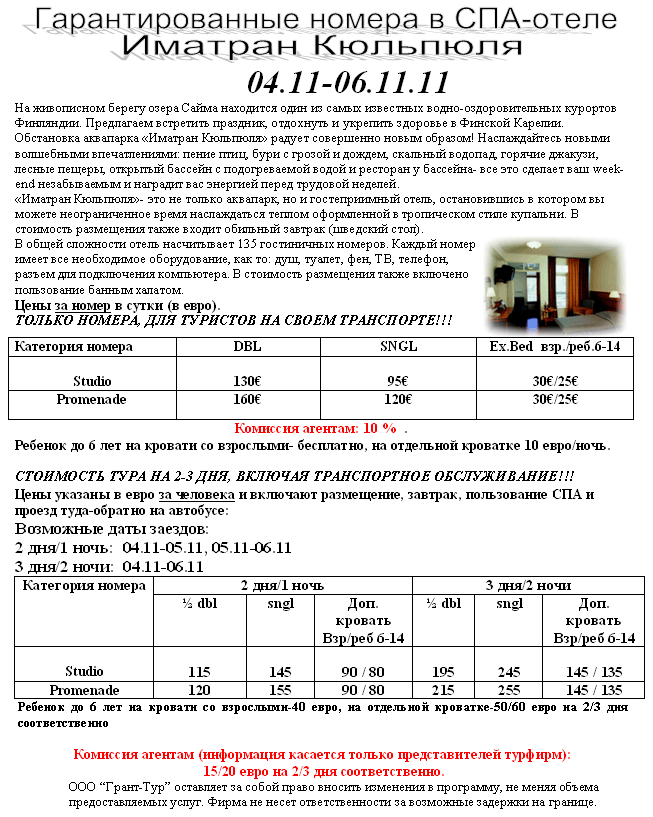 17 Окт 2011 10:08:14 ФИНЛЯНДИЯ Иматран Кюльпюля на ноябрьские праздники 04-06.11.11 от фирмы ГРАНТ-ТУР