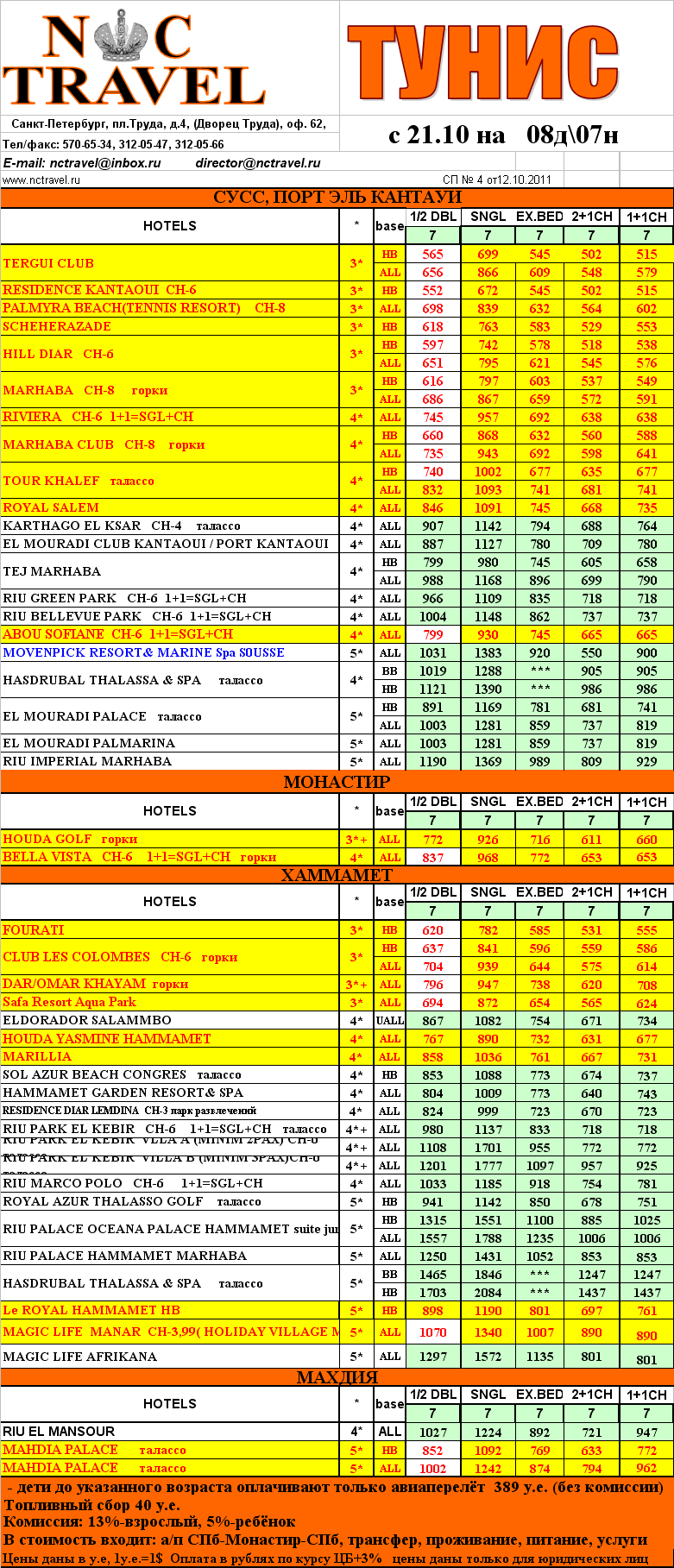 17 Окт 2011 14:32:33 ТУНИС НИЗКИЕ ЦЕНЫ с 21.10 на 7 ночей! КОМИССИЯ -13%! от фирмы NC TRAVEL
