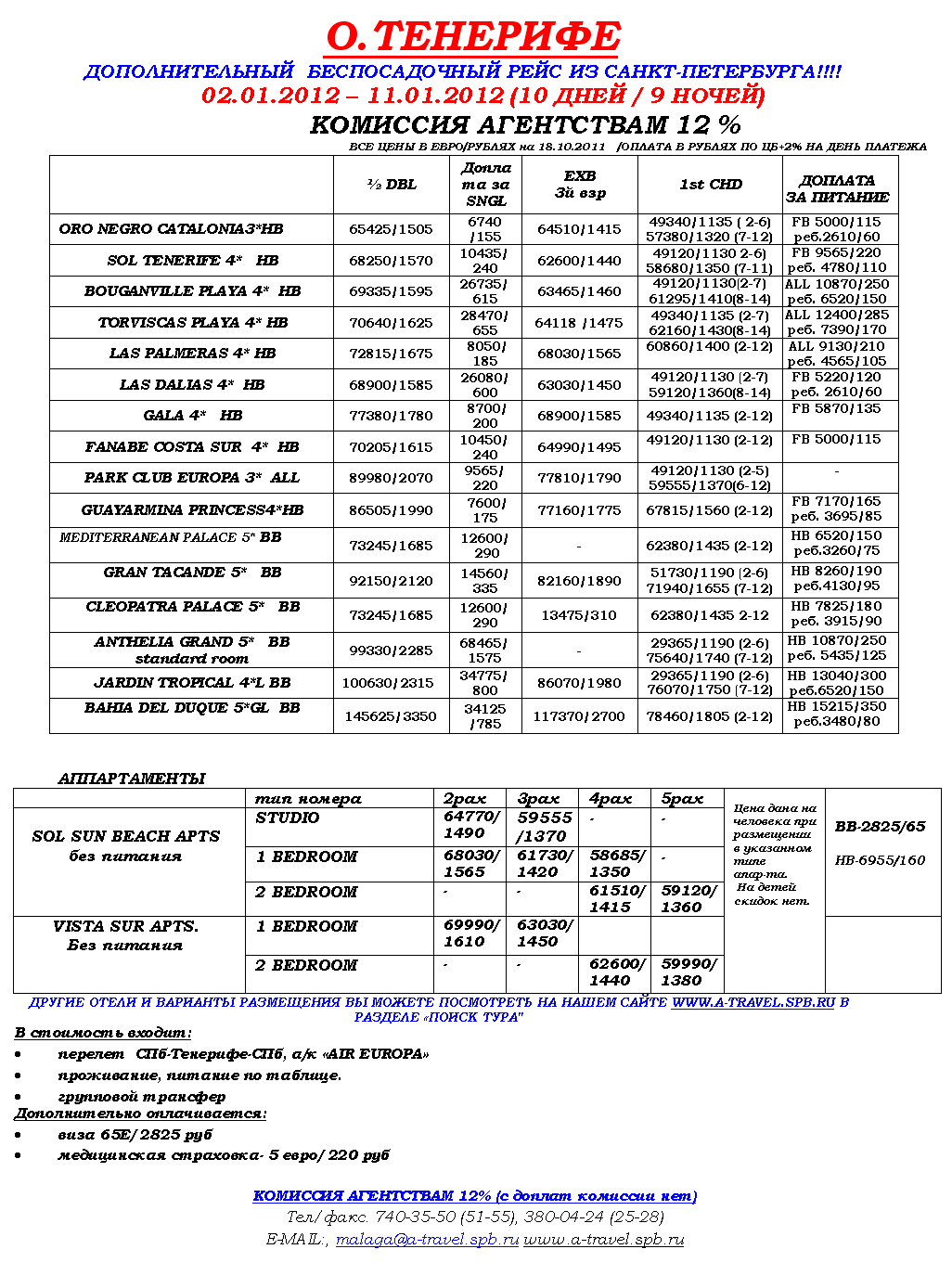 20 Окт 2011 11:15:59 ИСПАНИЯ - О.ТЕНЕРИФЕ 02.01.2012 - 11.01.2012 (10 ДНЕЙ / 9 НОЧЕЙ) от фирмы АКАДЕМИЯ