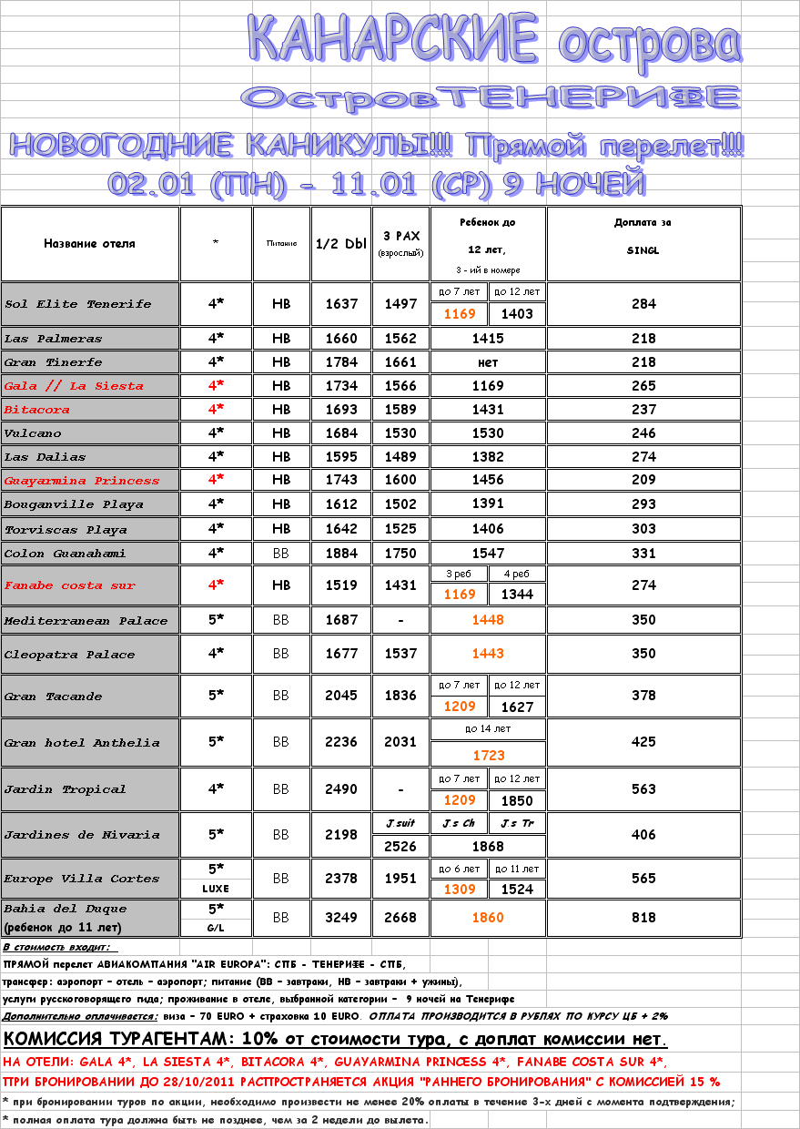ИСПАНИЯ. НОВОГОДНИЕ КАНИКУЛЫ Канарские острова: ТЕНЕРИФЕ 02/01/2012, ПОВЫШЕННАЯ КОМИССИЯ -15% от фирмы ФЛАМИНГО |