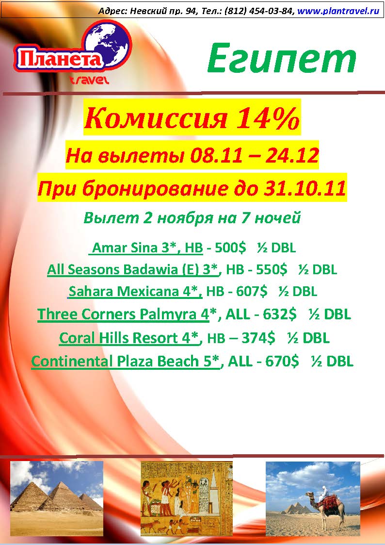 27 Окт 2011 12:27:59 ЕГИПЕТ. Комиссия 14% на туры в Египет от фирмы ПЛАНЕТА TRAVEL