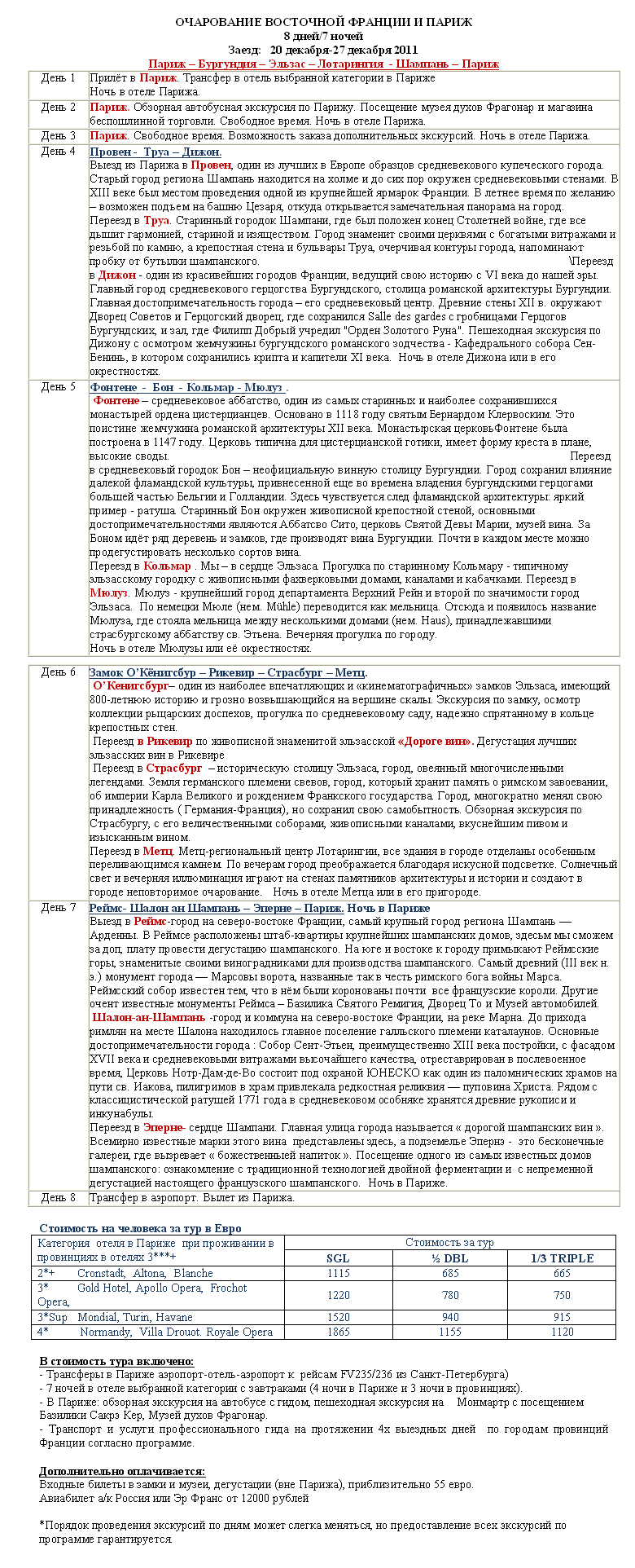 дополнительных экскурсий. Ночь в отеле Парижа. |