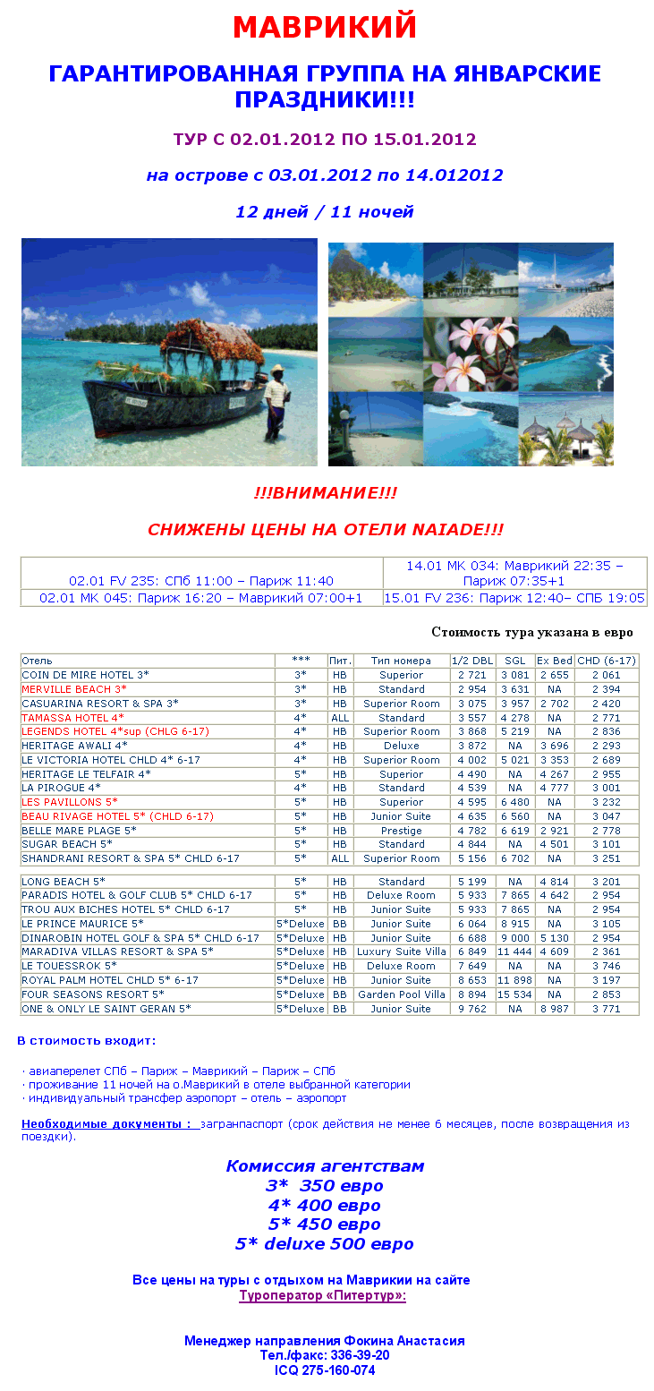 28 Окт 2011 14:25:30 МАВРИКИЙ на НОВЫЙ ГОД от 117 т.р. от фирмы ПИТЕРТУР