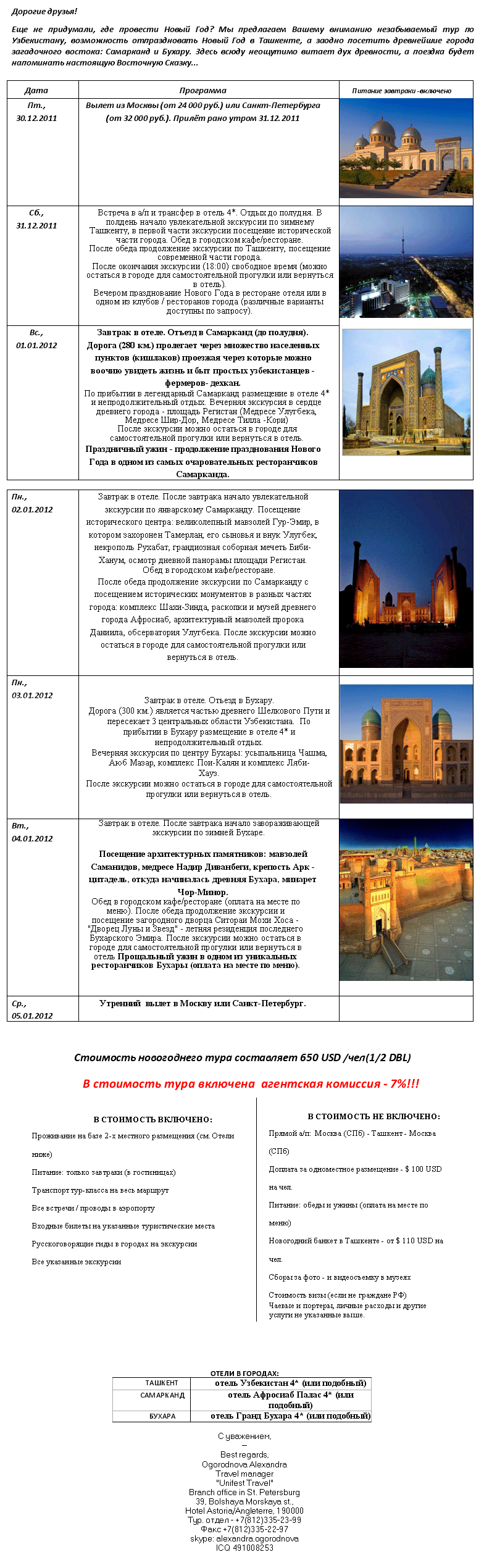 28 Окт 2011 17:48:39 УЗБЕКИСТАН - НОВОГОДНЯЯ СКАЗКА - Заезд 30.12 на 6 ночей от 650 usd+авиа!!! от фирмы UNIFEST TRAVEL