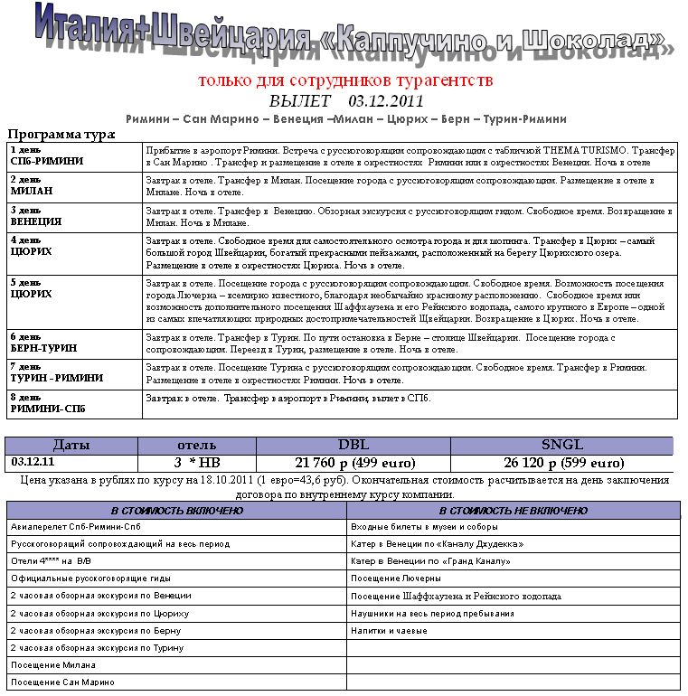 02 Ноя 2011 12:10:07 ИТАЛИЯ-ШВЕЙЦАРИЯ 03.12-09.12 Рекламный тур Каппучино (Римини) от фирмы ФЛАМИНГО