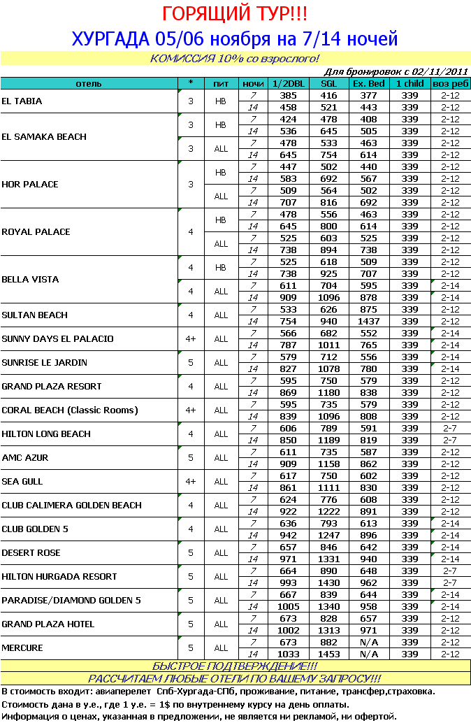 02 Ноя 2011 12:31:17 ЕГИПЕТ - ХУРГАДА 05/06 ноября на 7/14 ночей от фирмы БАГИРА