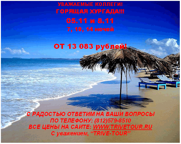 | 02 Ноя 2011 | 16:35:32 | ЕГИПЕТ - ХУРГАДА 05.11 и 08.11 от 13 083 рублей от фирмы TRIVE ТУР |