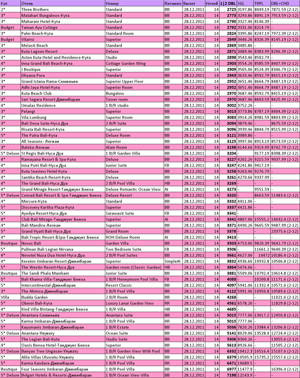 Бали) - Сингапур (минимальный тариф); • проживание на о.Бали в