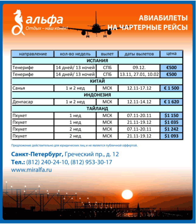 07 Ноя 2011 13:01:54 АВИАБИЛЕТЫ на чартерные рейсы от фирмы АЛЬФА СТ