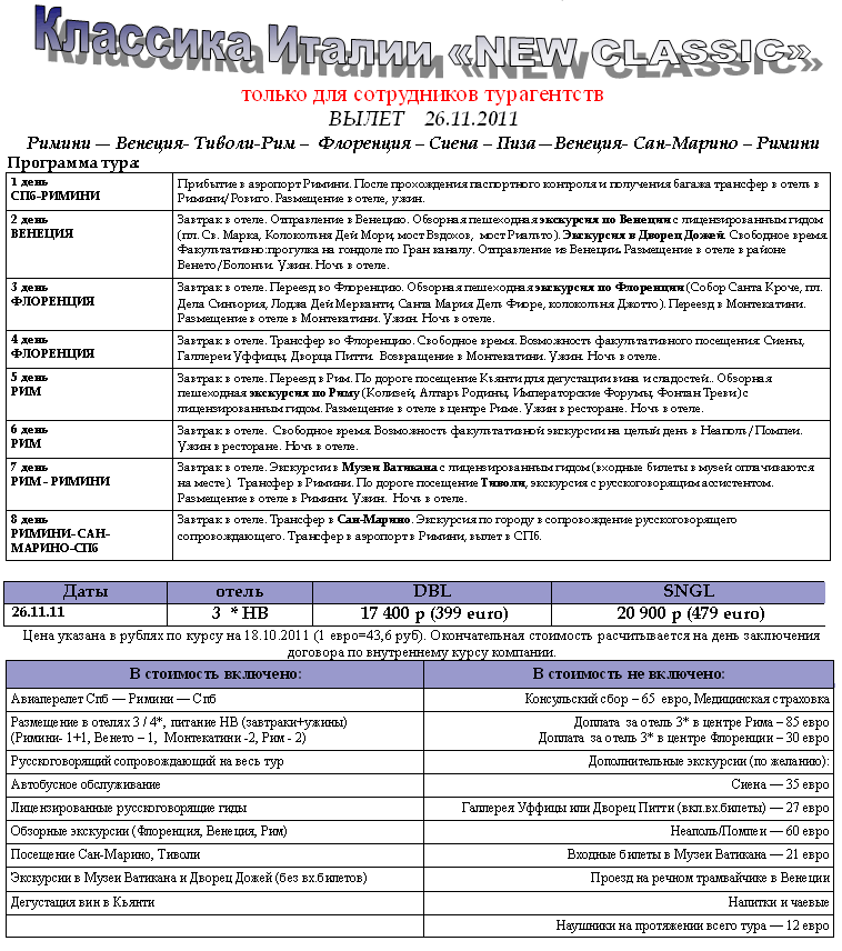 14 Ноя 2011 11:50:11 ИТАЛИЯ 26.11 на 8дн Рекламный тур NEW CLASSIC HB (Римини) от фирмы ФЛАМИНГО