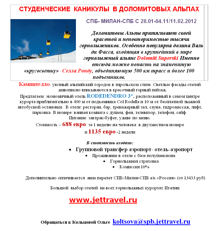 02 Дек 2011 15:08:09 ИТАЛИЯ. СТУДЕНЧЕСКИЕ КАНИКУЛЫ В ДОЛОМИТОВЫХ АЛЬПАХ СПБ-МИЛАН-СПБ С 28.01-04.11/11.02.2012 от фирмы ДЖЕТ ТРЕВЕЛ САНКТ-ПЕТЕРБУРГ
