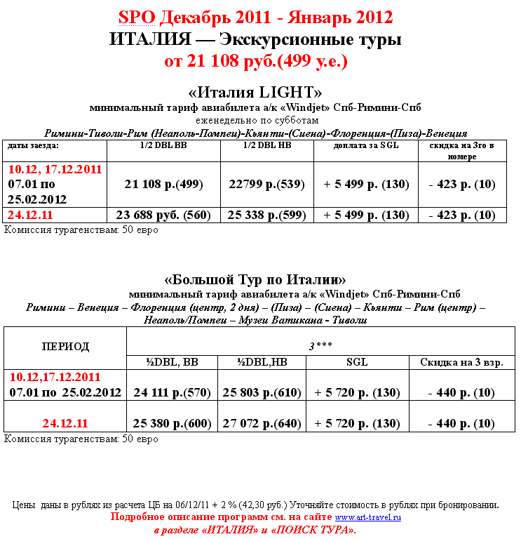 06 Дек 2011 15:30:19 ИТАЛИЯ. SPO на 10.12, 17.12, 24.12.11 - январь 2012 от 499 у.е. экскурсионные туры от фирмы АРТ-ТРЕВЕЛ