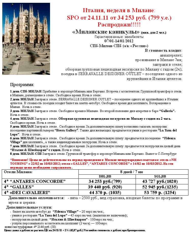 06 Дек 2011 16:25:26 ИТАЛИЯ SPO на 07.01.12 "Миланские каникулы" от 799 у.е. РАСПРОДАЖИ - от фирмы АРТ-ТРЕВЕЛ