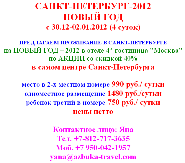 26 Дек 2011 17:23:06 РОССИЯ - Санкт-Петербург на Новый Год 30.12-02.01 гостиница Москва 4* - СКИДКА 40% от фирмы АЗБУКА ПУТЕШЕСТВИЙ